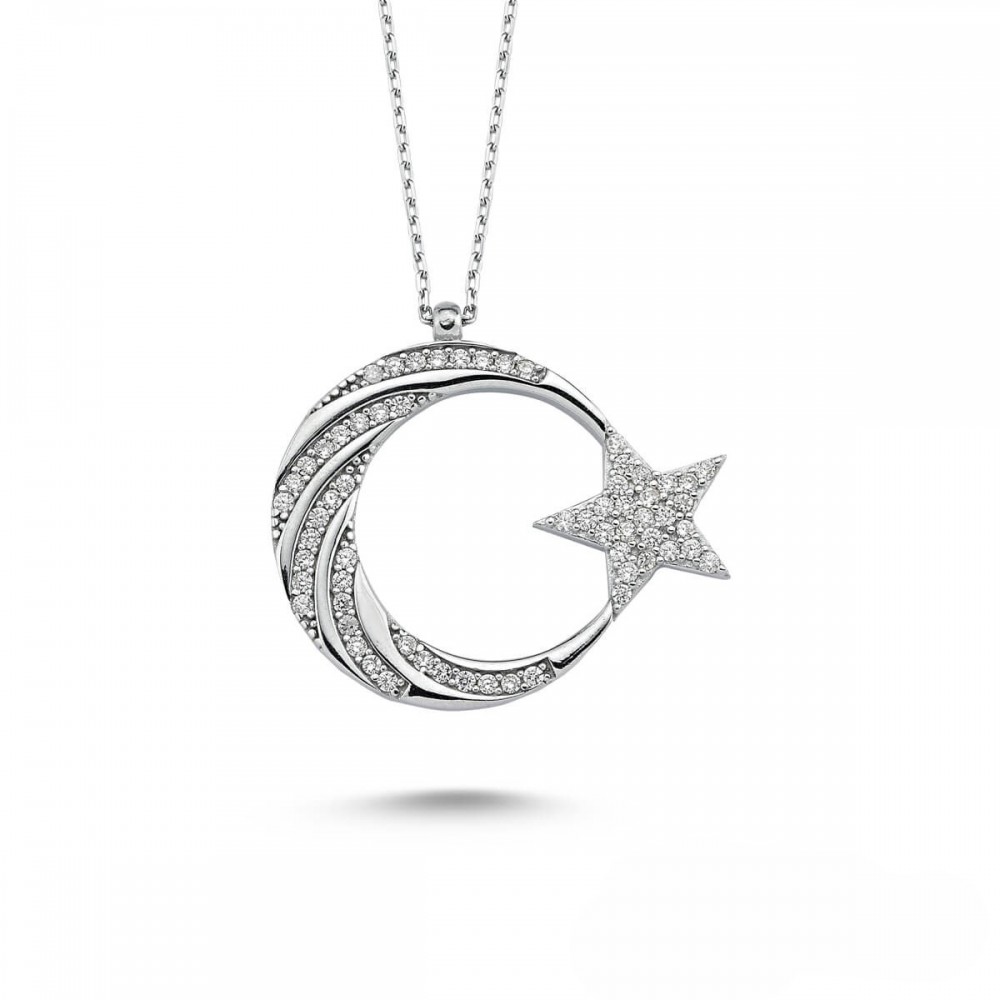 Burgu Taş İşlemeli Ay Yıldız Gümüş Kolye MY101800
